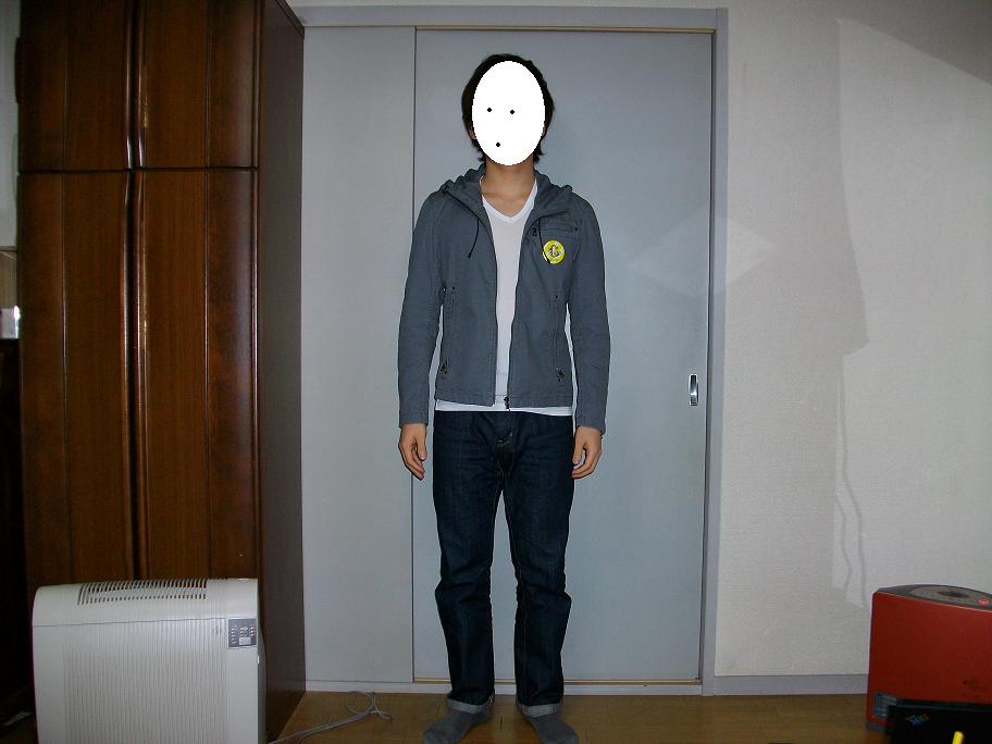 コットンミリタリースキニーフーデッドブルゾン、スリムフィットストレートジーンズアウター 2010.03.09ユニクロの一般店で売られるブルゾンとしてはDIを除いて最も細いのではないでしょうか。色はグレーで、缶バッジをつけてみました。シャツと合わせる方がいい気がします。シャツは無印良品のストレッチブロードストライプシャツ。セールで1000円でした。早くユニクロでも裾を出して着れるシャツが出てほしいものです。