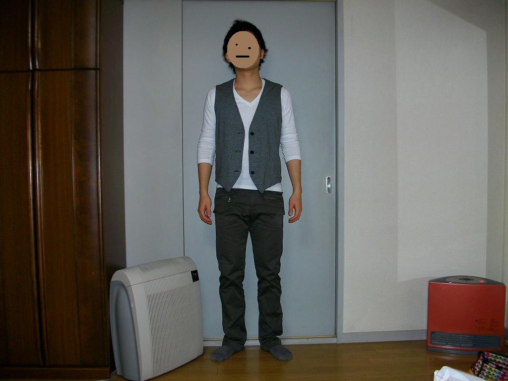 ボトムスはストレッチデザインスタイルアップパンツのオリーブ。
