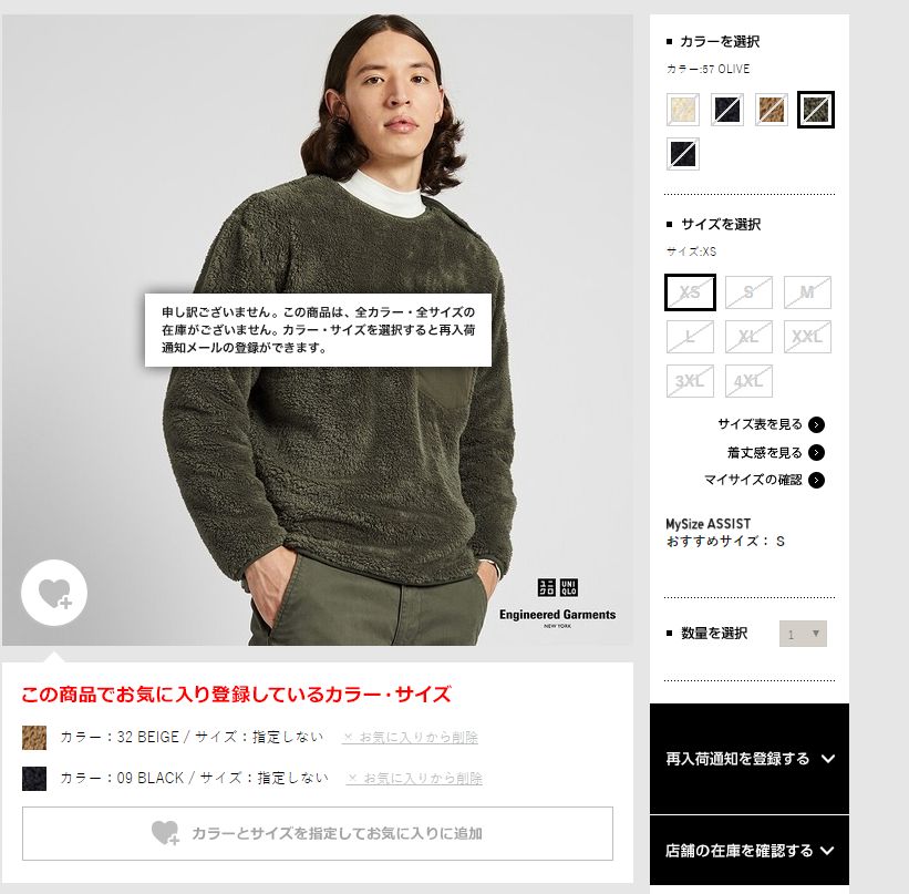 色とサイズを選択すると、再入荷通知を設定できます。